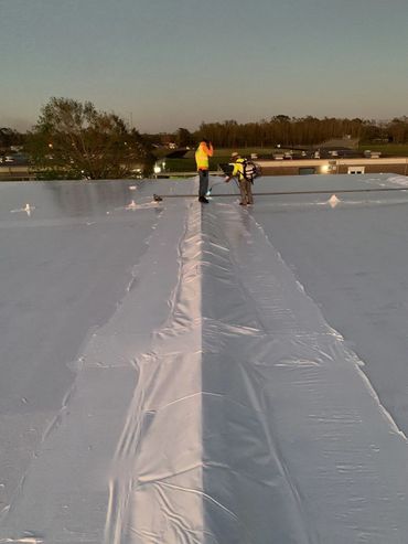 WrapRoof™ Certified Installation Crews are available for your job sites. Our crews come fully trained with their own housing, food, equipment, labor and material ready to install day or night. Our commercial portfolio includes projects as large as 300,000 square feet including schools, government buildings, apartments, military base work and flat roofs. Our crews can wrap thousands of squares daily and take extreme pride in their workmanship. Flat Roofs, Tile and Pitched Roofs, Walls, and any other structures that needs to be water tight. If you contract the project we can wrap it as your labor crew. Let us be your partner in the roof wrap industry.